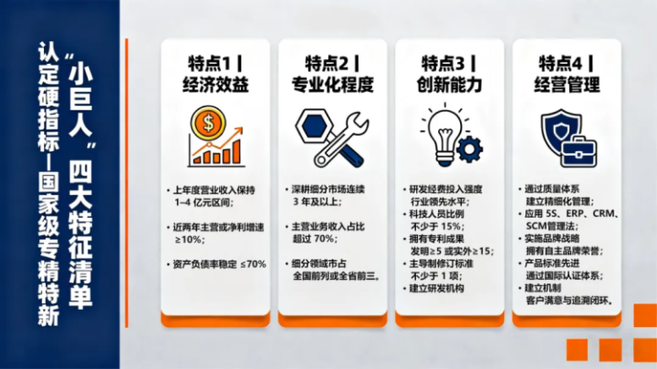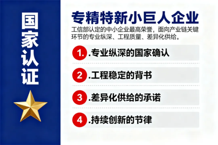 国家级专精特新“小巨人”企业是由工业和信息化部组织认定的中小企业最高荣誉,2025年认定通过率不超过25%,代表企业在国家产业链关键环节中具备突出的专业化、精细化、特色化和创新能力。认定工作由工信部统一标准、统一程序组织实施,并实行动态管理与定期复核,确保“小巨人”企业始终保持技术领先、质量稳定与行业引领。
